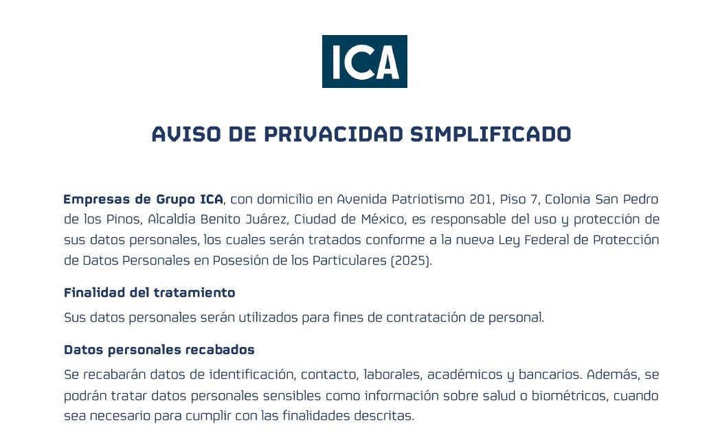 Nuestra Política de Capital Humano está vinculada a la misión y los valores de ICA para la construcción de una mejor sociedad con principios de integridad, colaboración y trabajo en equipo.