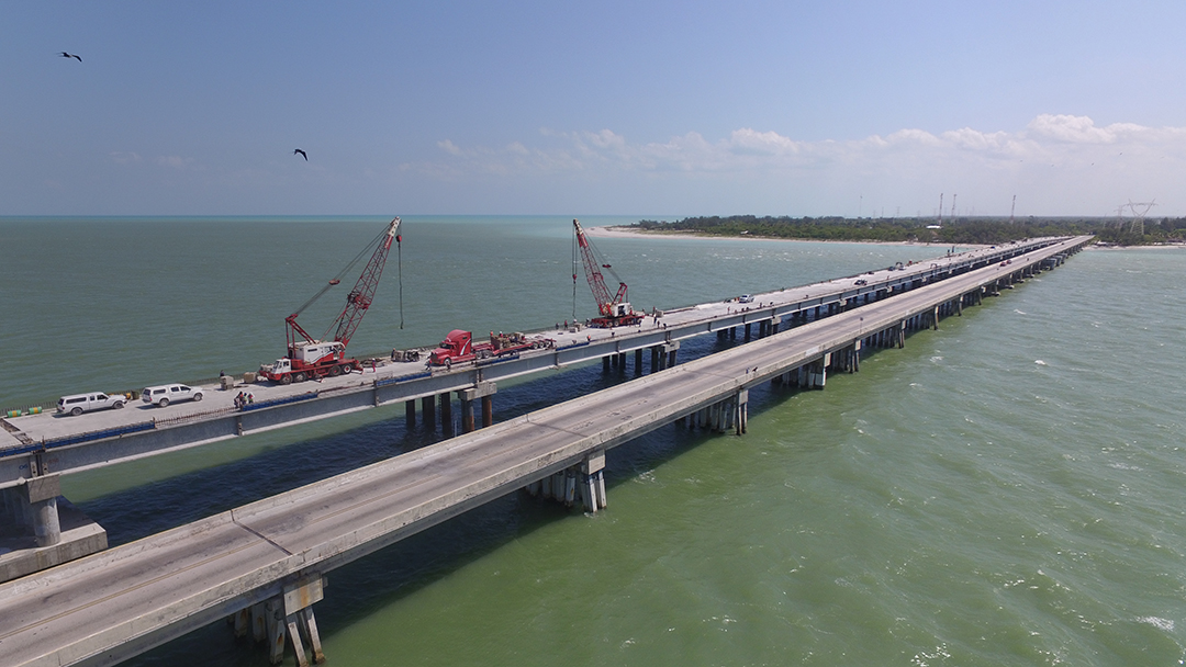 Conecta Isla del Carmen e Isla Aguada en Campeche con una cimentación profunda de 578 pilotes a 25 metros por debajo del lecho marino y una longitud de 3.2 kilómetros.